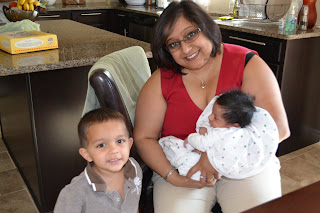 Later that afternoon we headed over to Devin's Nana and Nani's house (my parents) for a quick visit. Devin had a great time showing off his new skill: smiling! He was so stinkin' cute, and definitely looked like he had something to tell all of us! Lol!